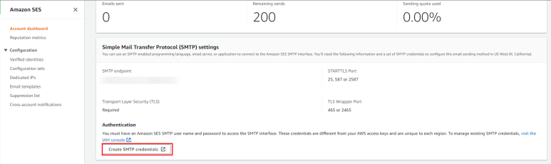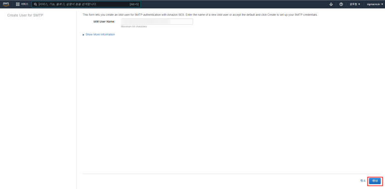 그리고 PHPMailer에서 사용할 SMTP 유저명과 패스워드를 받기 위해 Create SMTP Credentials를 선택합니다.