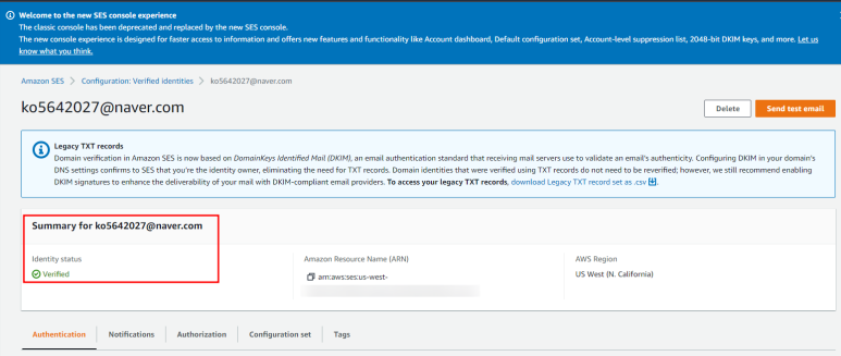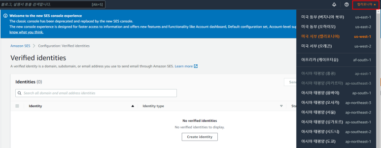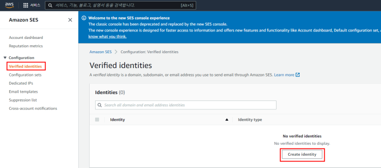 그리고 왼쪽 메뉴에서 Configuration > Verified identities > Create identity를 선택합니다.