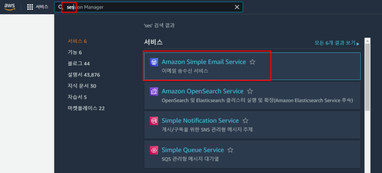먼저 AWS 사이트에 로그인을 하고 서비 스텝에서 SES라고 검색합니다.